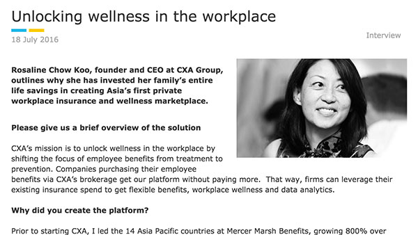去年,Global Health Insider(GHI)有幸采访了CXA的创始人兼首席执行官Rosaline Koo,他谈到“扰乱亚洲员工福利”的话题。今年GHI采访了她公司内部的发展,尤其是他们不断扩大的市场,对保险科技领域的新投资以及CXA在亚洲的整体发展。